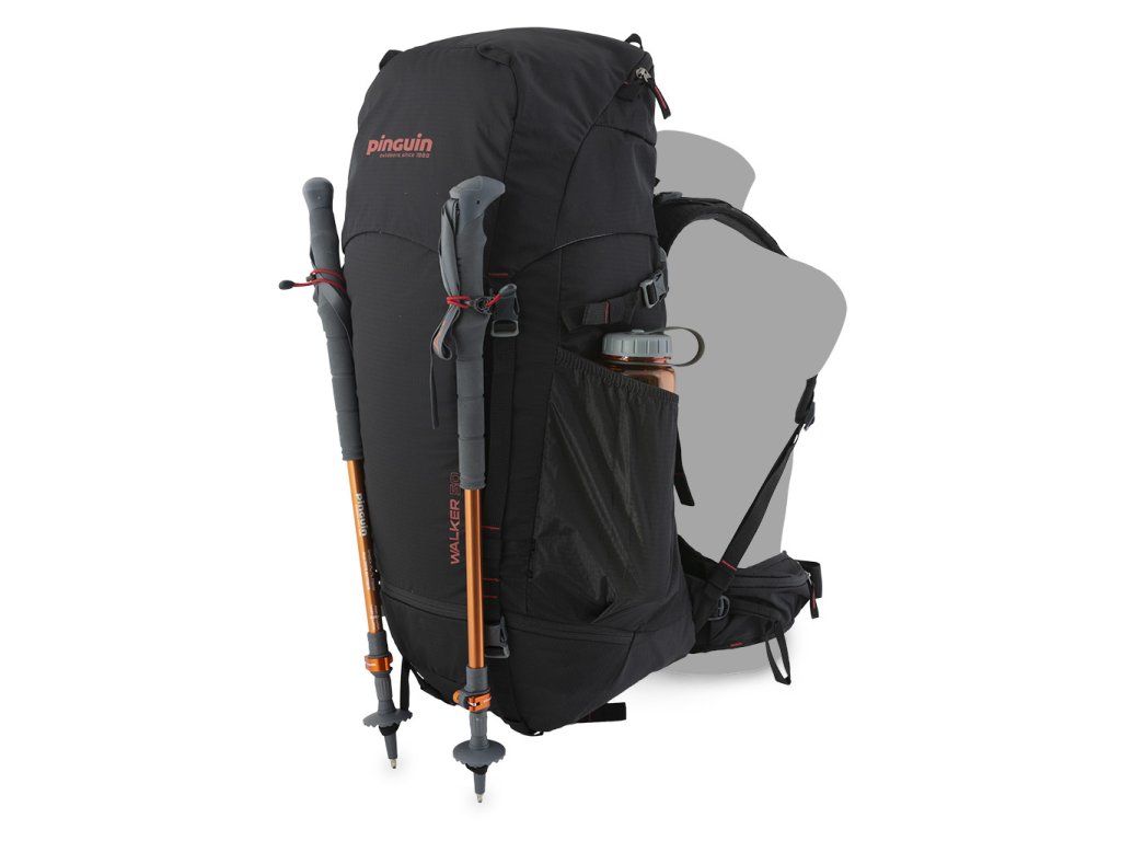 - Pružná poutka s háčky na připevnění trekových holí na čele a poutka na dně batohu.