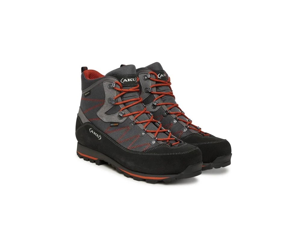 Svršek je vyroben z broušené 1,8 mm široké kůže v kombinaci s patentovanou textilií AIR 8000. Díky tomu je bota pevná a zároveň prodyšná. Podšívku zajišťuje nepromokavá membrána Gore-Tex Performance Comfort a tak se v této botě nemusíte bát projít potokem či tajícím sněhem. O pohodlí při došlapu se stará mezipodešev EVA s dvojí hustotou pěny společně s tlumením IMS1, které vám dodá jistotu i v náročnějším terénu. Pohodlí a bezpečí také doplňuje nová semišová obsázka kolem celé boty. Špička je proti okopům o kameny či kořeny stromů zpevněná tvrdou gumou. O pevný záběr je zde postaráno díky podešvi VIBRAM Curcuma, která je exkluzivní pouze pro firmu AKU.