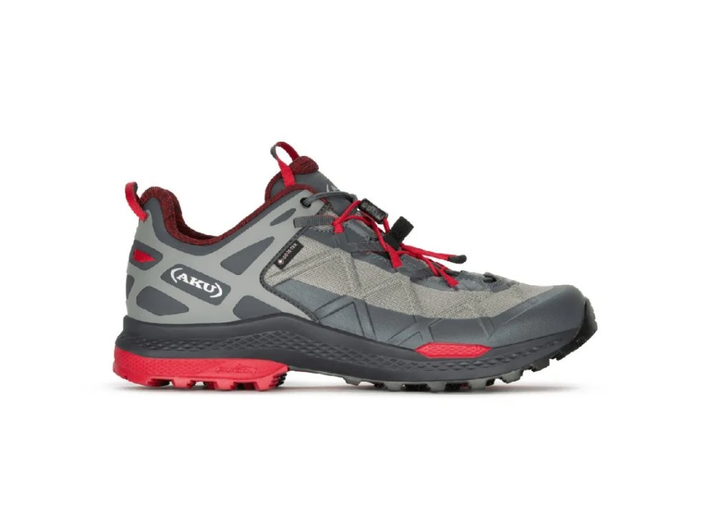 Dynamická a spolehlivá i na náročnějších trasách - turistická obuv na rychlejší výšlapy Rocket DFS GTX. Využívá inovativní technologii Vibram Traction Lug, která díky speciálnímu designu zlepšuje trakci a přilnavost o 25 %. Svršek má křížovou žebrovanou strukturu a je chráněn 3D tištěnou vrstvou. Exkluzivní technologie AKU Dual Fit System (DFS), zde realizovaná ve verzi pro rychlou turistiku, umožňuje měnit přesnost uchycení pouhým působením na dva různé systémy šněrování. Je vyrobena s technologií AKU Elica Natural Stride System, která podporuje biodynamickou účinnost.