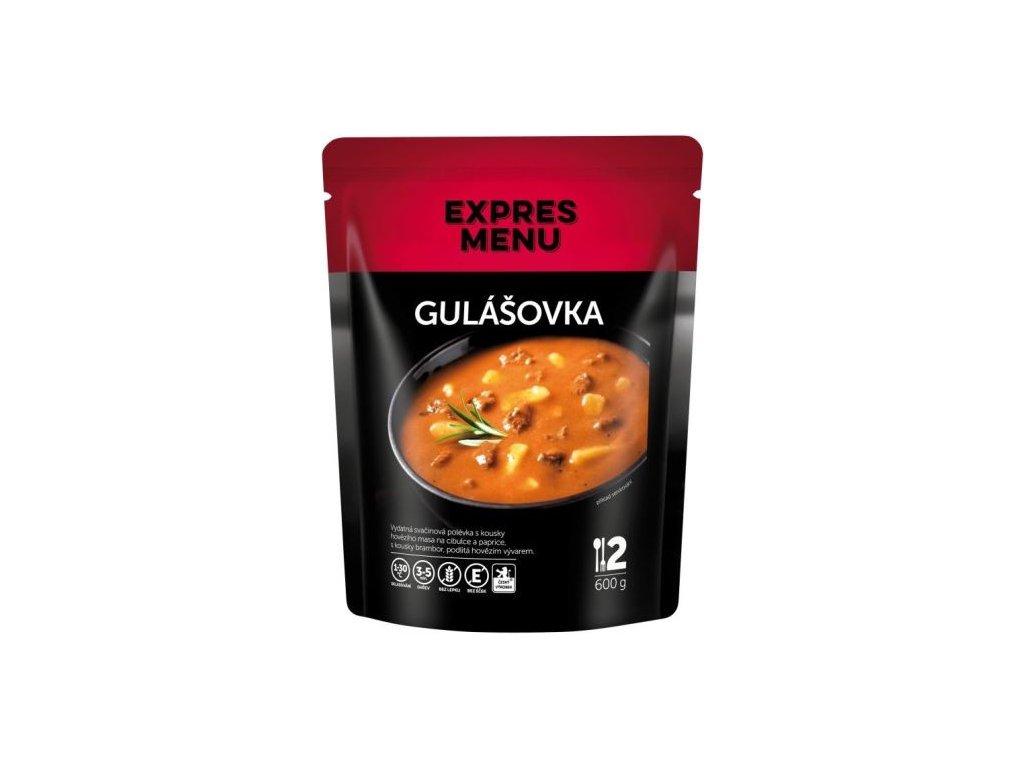 Vydatná svačinová polévka s kousky hovězího masa a brambor. Maso je orestované na cibulce a paprice, zalité hovězím vývarem. Polévka je dochucená majoránkou a česnekem.