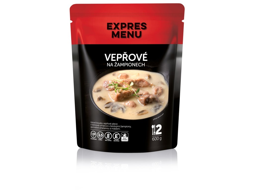 Libové kousky vepřové plece v krémové omáčce s čerstvými žampiony, zjemněné smetanou a máslem.